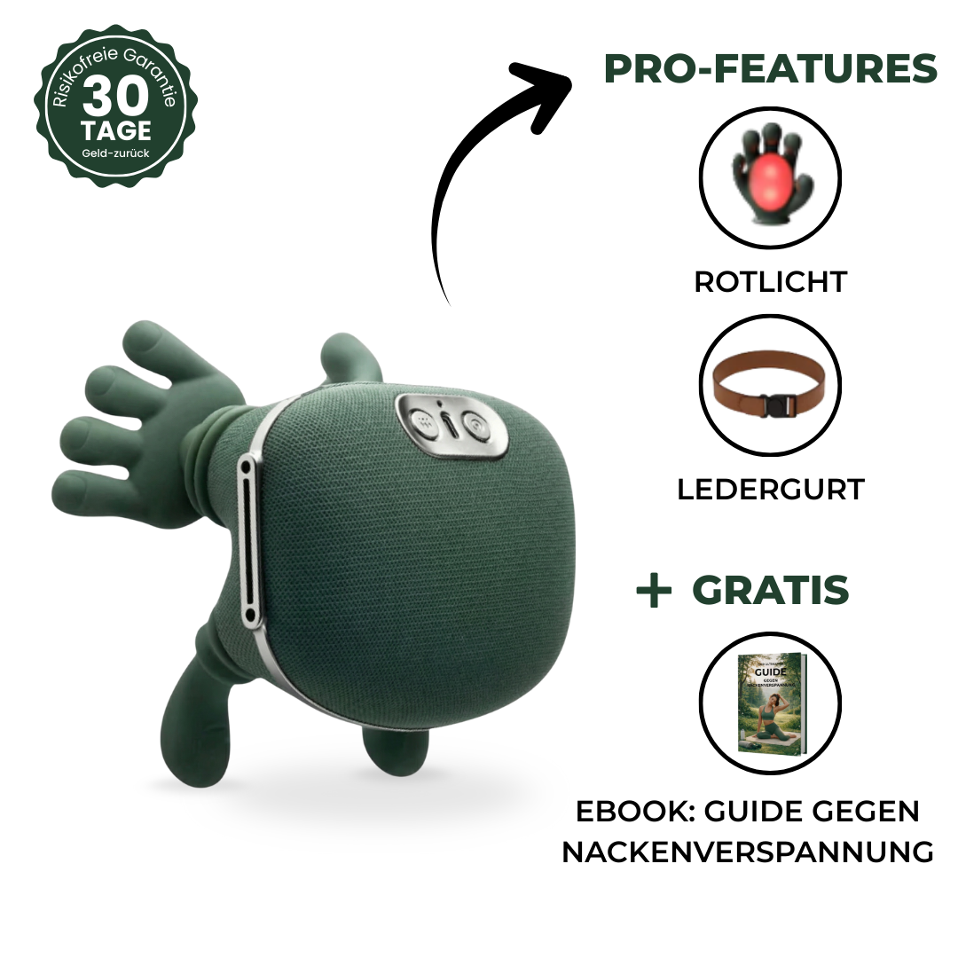 TheraTouch kombiniert eine tiefenentspannende Massage, wohltuende Wärme und moderne Rotlichttechnologie in einem kompakten Gerät – für ein angenehmes Wohlgefühl im Nackenbereich.